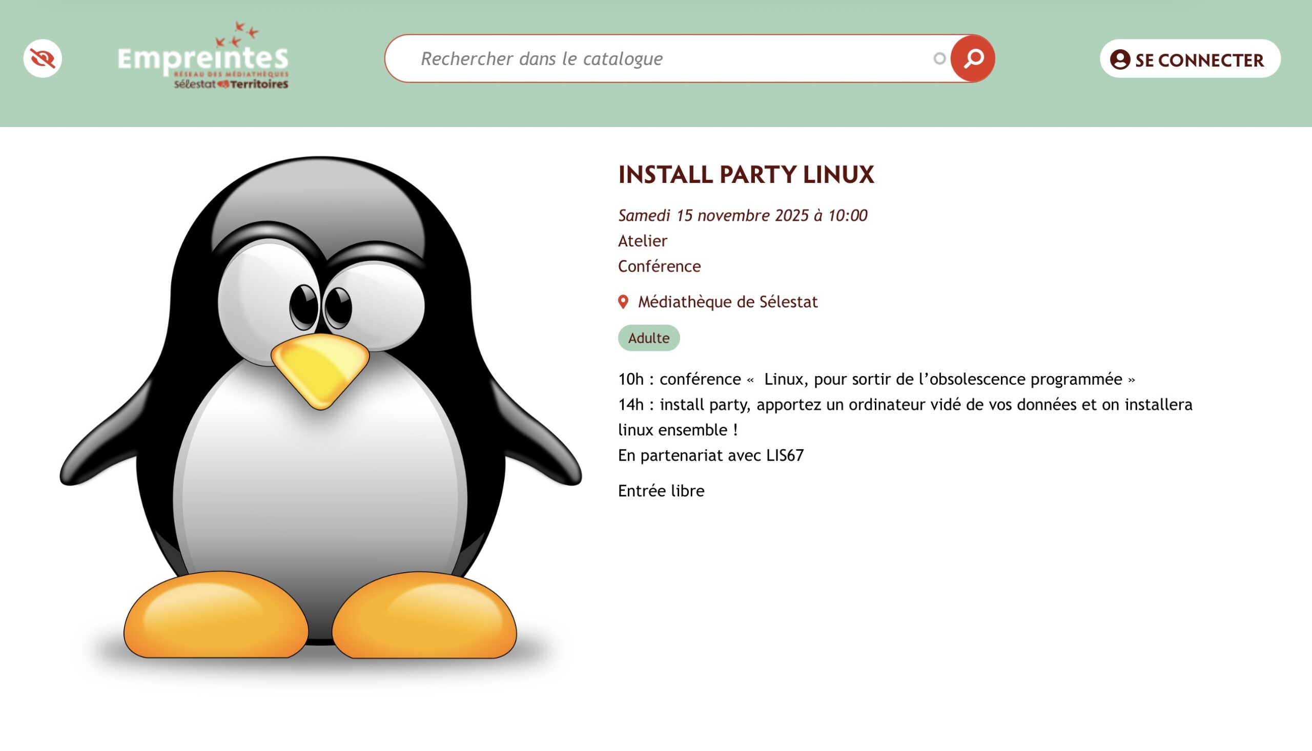 Voici le lien pour vous connecter sur la page de la Médiathèque de Sélestat : https://www.empreintes-mediatheques.fr/evenement/install-party-linux
